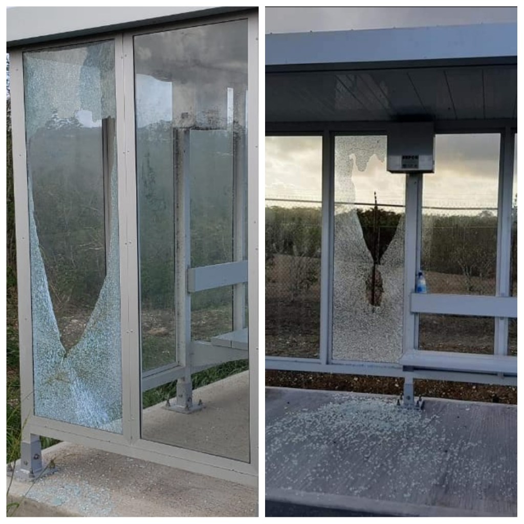 This is the second bus shed on the newly resurfaced highway that has been damaged. Another bus shed located in close proximity was seen earlier this year with similar damages after its rear glass was broken. Both structures are yet to be repaired.