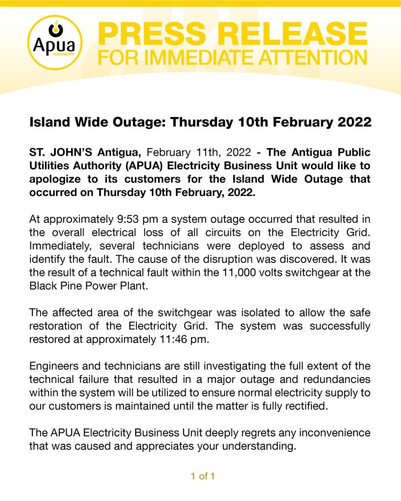 ST. JOHN’S Antigua, February 11th, 2022 – The Antigua Public Utilities Authority (APUA) Electricity Business Unit would like to apologize to its customers for the Island Wide Outage that occurred on Thursday 10th February 2022.