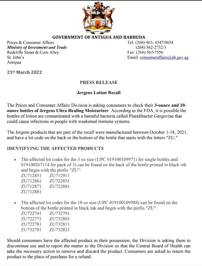 The Prices and Consumer Affairs Division is asking consumers to check their 3-ounce and 10- ounce bottles of Jergens Ultra Healing Moisturizer. According to the FDA, it is possible the bottles of lotion are contaminated with a harmful bacteria called Pluralibacter Gergoviae that could cause infections in people with weakened immune systems.