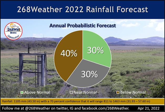 The year will most likely be another drier than usual one for Antigua. My early forecast calls for the rainfall total for 2022 to most likely be 1105 mm (43.50 in) with a 70 percent or high confidence of it being in the range of 811 to 1463 mm (31.93 to 57.60 in).