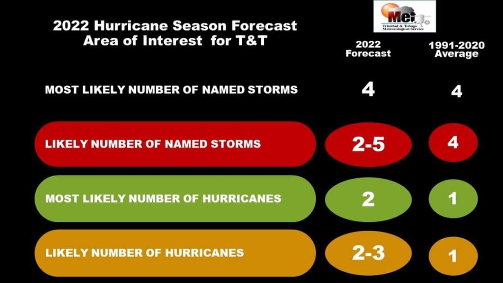 The Trinidad and Tobago Meteorological Service (TTMS) 2022 Hurricane Season Prediction favours 4 tropical storms as the most likely number of storms to form in the area of interest for Trinidad and Tobago. However, the likely range is 2 to 5 tropical storms forming in the area.
