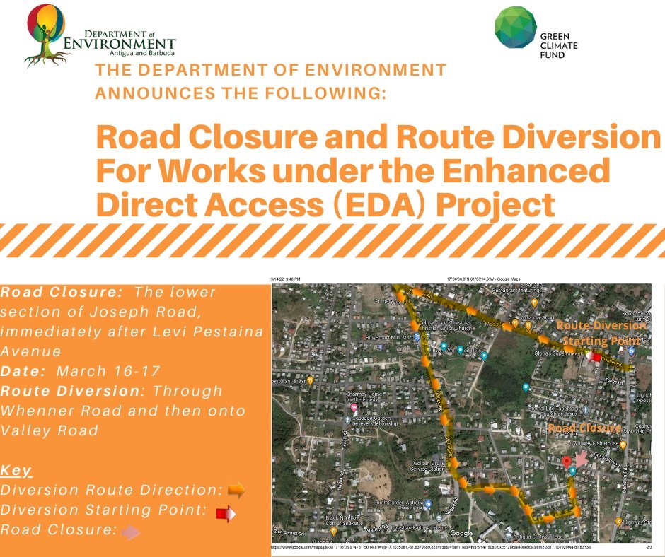 This closure will take place from Wednesday, May 18 for approximately 8-12 weeks to accommodate the construction of a culvert under Component 2 of the Green Climate Fund (GCF) supported Enhanced Direct Access (EDA) project being carried out by the Department of Environment within the Cashew Hill watershed and surrounding communities.