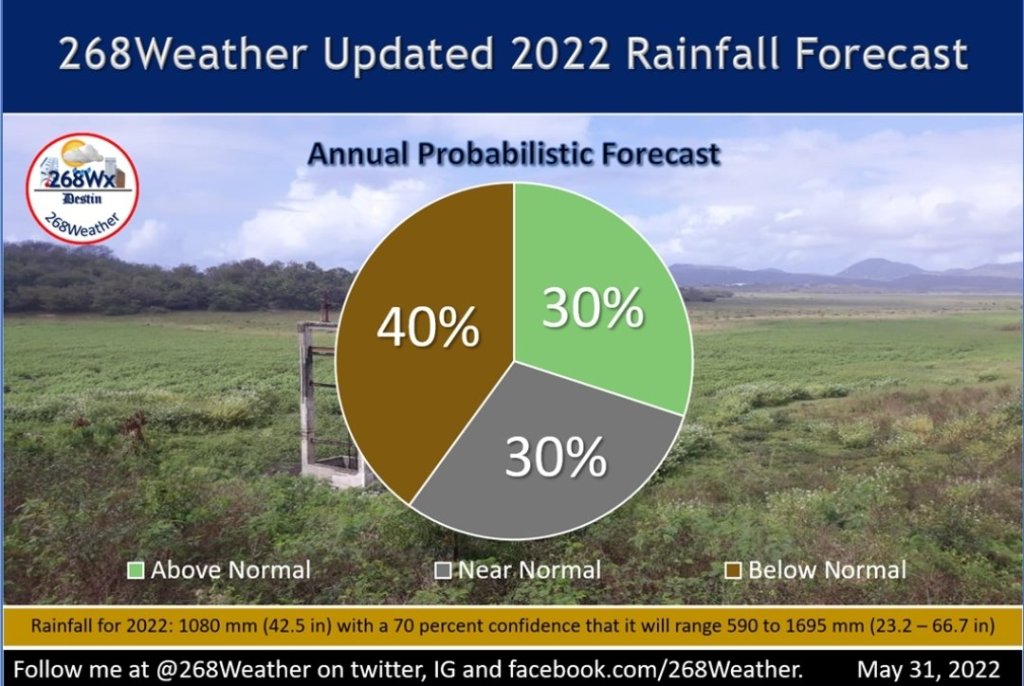 Dale C. S. Destin | The prediction for rainfall remains discouraging. My latest forecast continues to call for most likely below normal rainfall for Antigua. The most likely total for the year is 1080 (42.5 in), down 25 mm (1 in) from the previous forecast.