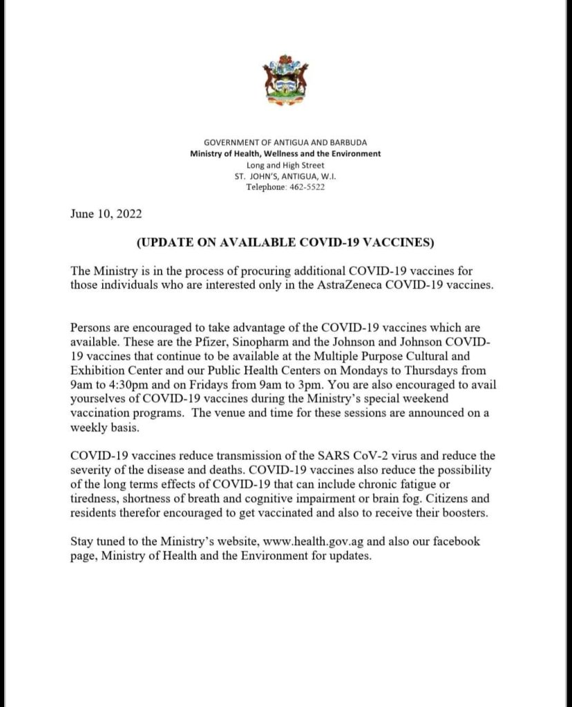 Stay tuned to the Ministry’s website, http://www.health.gov.ag and also our Facebook page, Ministry of Health and the Environment for updates.