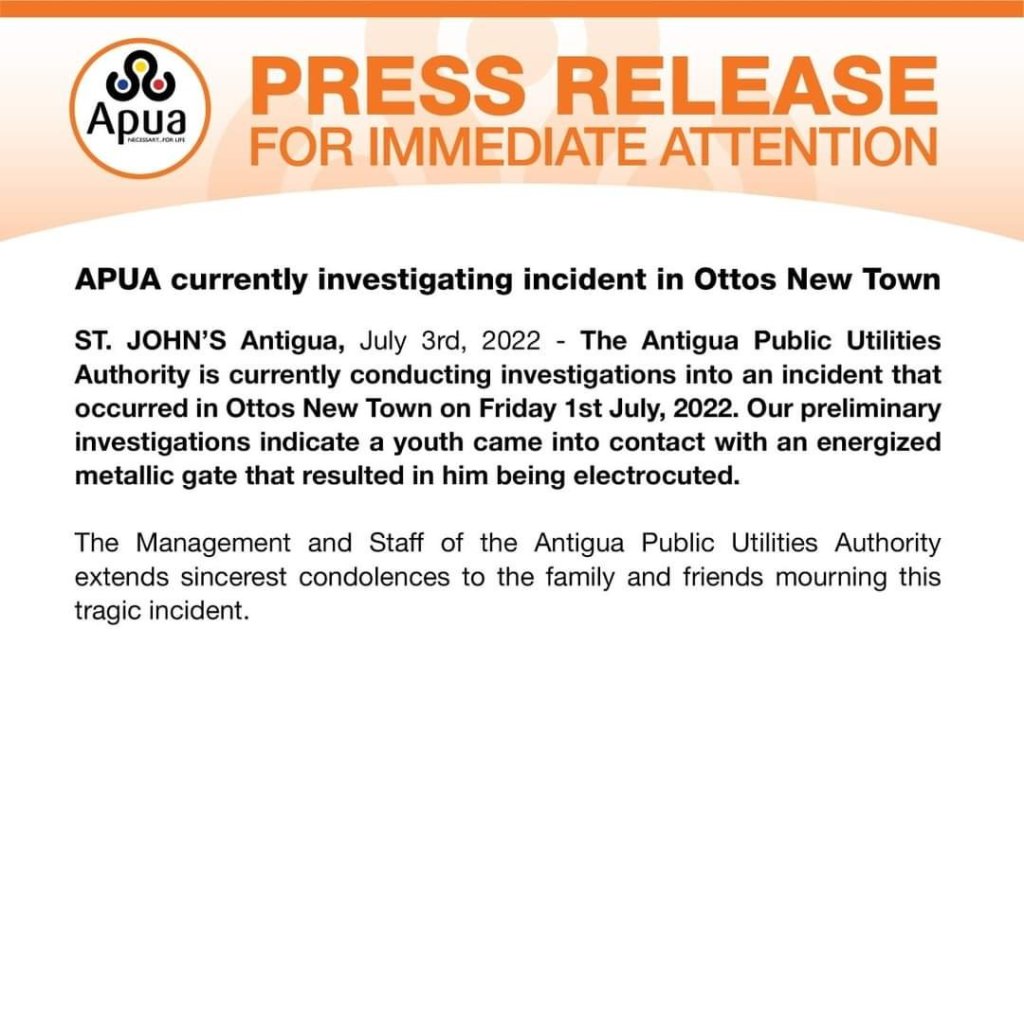 The Management and Staff of the Antigua Public Utilities Authority extends sincerest condolences to the family and friends mourning this tragic incident.