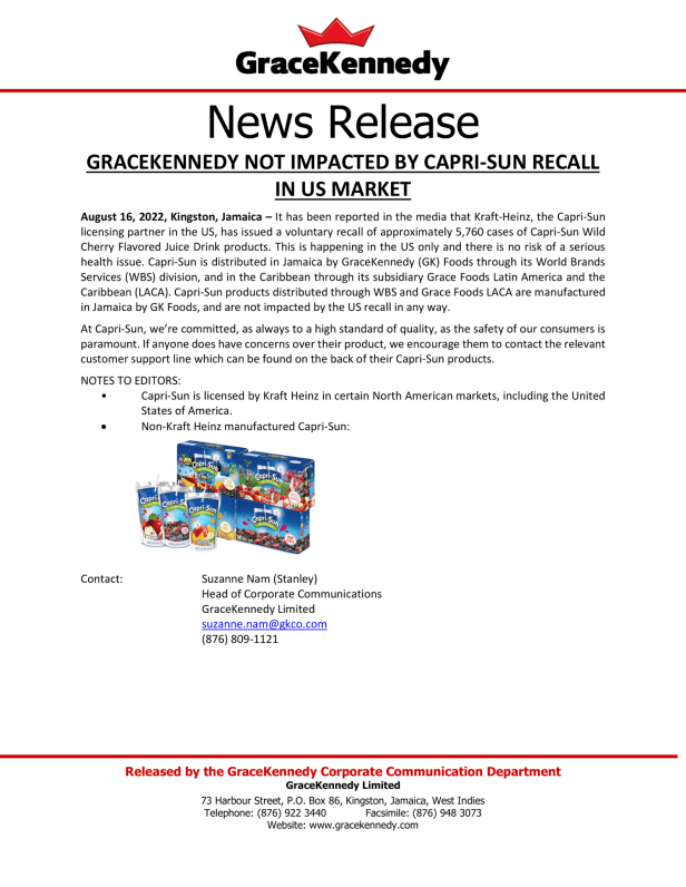 August 16, 2022, Kingston, Jamaica – It has been reported in the media that Kraft-Heinz, the Capri-Sun licensing partner in the US, has issued a voluntary recall of approximately 5,760 cases of Capri-Sun Wild Cherry Flavored Juice Drink products.