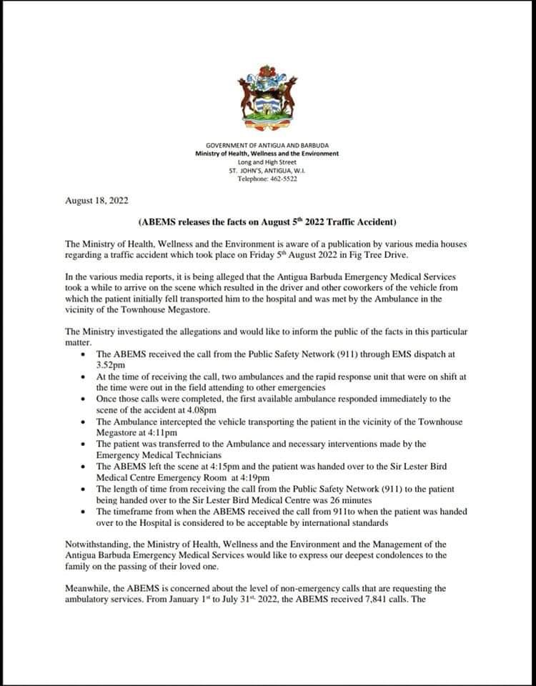 Notwithstanding, the Ministry of Health, Wellness and the Environment and the Management of the Antigua Barbuda Emergency Medical Services would like to express our deepest condolences to the family on the passing of their loved one.