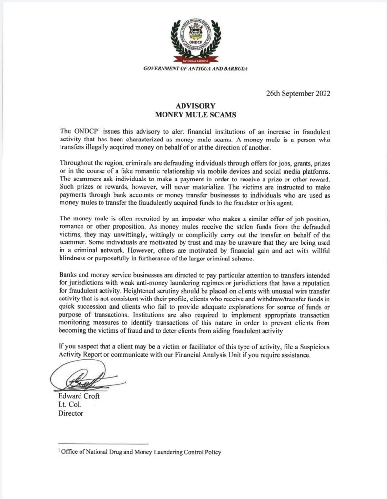 Office of National Drug and Money Laundering Control Policy (ONDCP) – The ONDCP issues this advisory to alert financial institutions of an increase in fraudulent activity that has been characterized as money mule scams. A money mule is a person who transfers illegally acquired money on behalf of or at the direction of another.