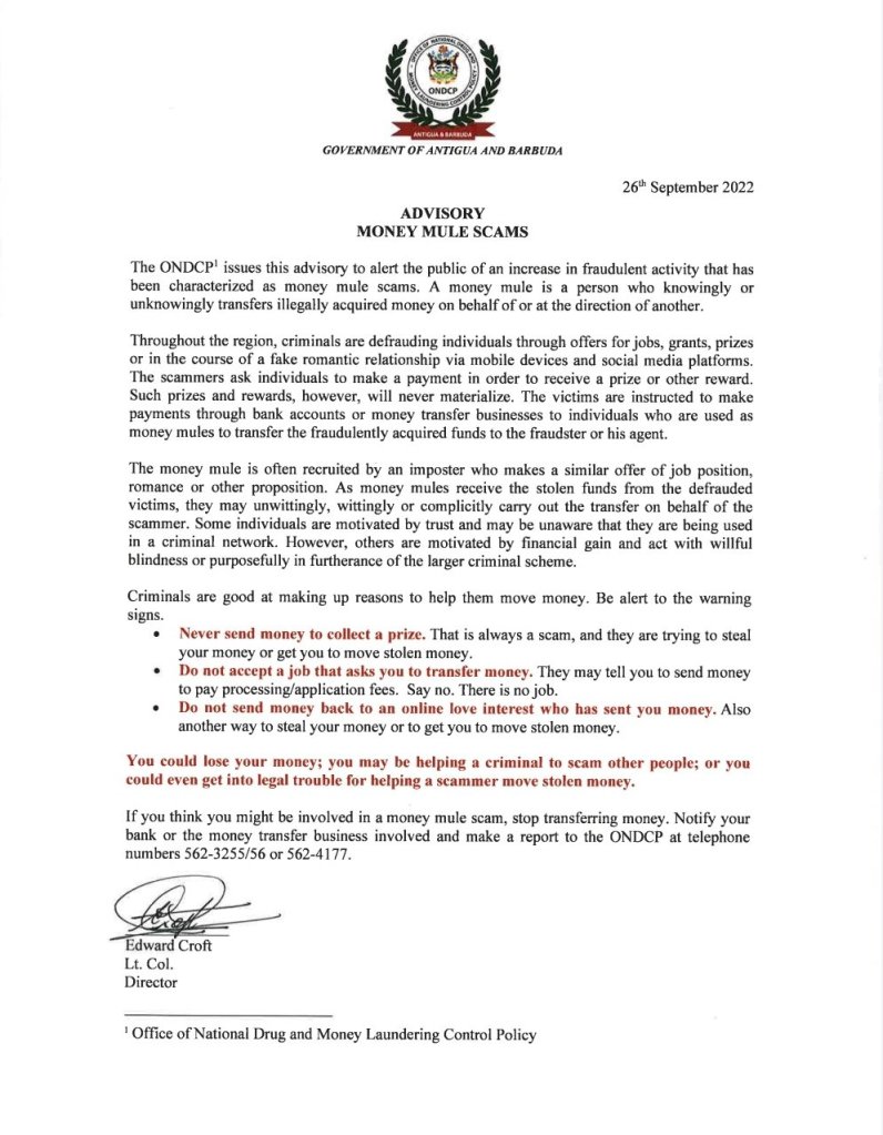 If you think you might be involved in a money mule scam, stop transferring money. Notify your bank or the money transfer business involved and make a report to the ONDCP at telephone numbers 562-3255/56 or 562-4177.