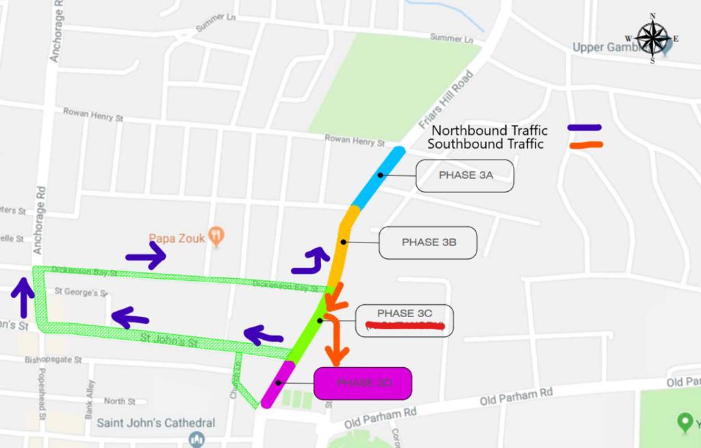 Northbound: Traffic is asked to make a left turn unto St Johns Street heading west then a right turn onto Popeshead Street heading north, then a right turn unto Dickenson Bay Street heading east then a left turn onto Friars Hill Road.