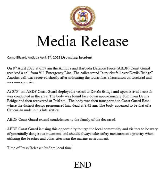 Press Statement from the Royal Police Force of Antigua and Barbuda – Police Investigate Drowning of Canadian Citizen