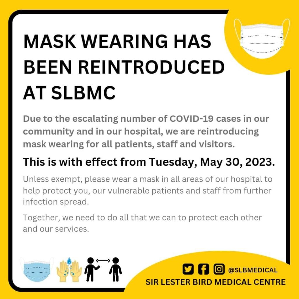 SIR LESTER BIRD MEDICAL CENTRE (SLBMC) – Due to the escalating number of COVID-19 cases in our community and in our hospitals, we are reintroducing mask-wearing for all patients, staff and visitors.