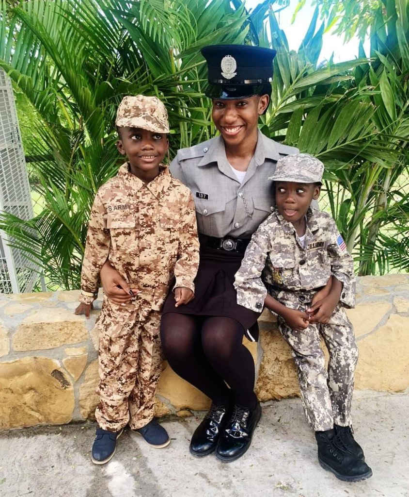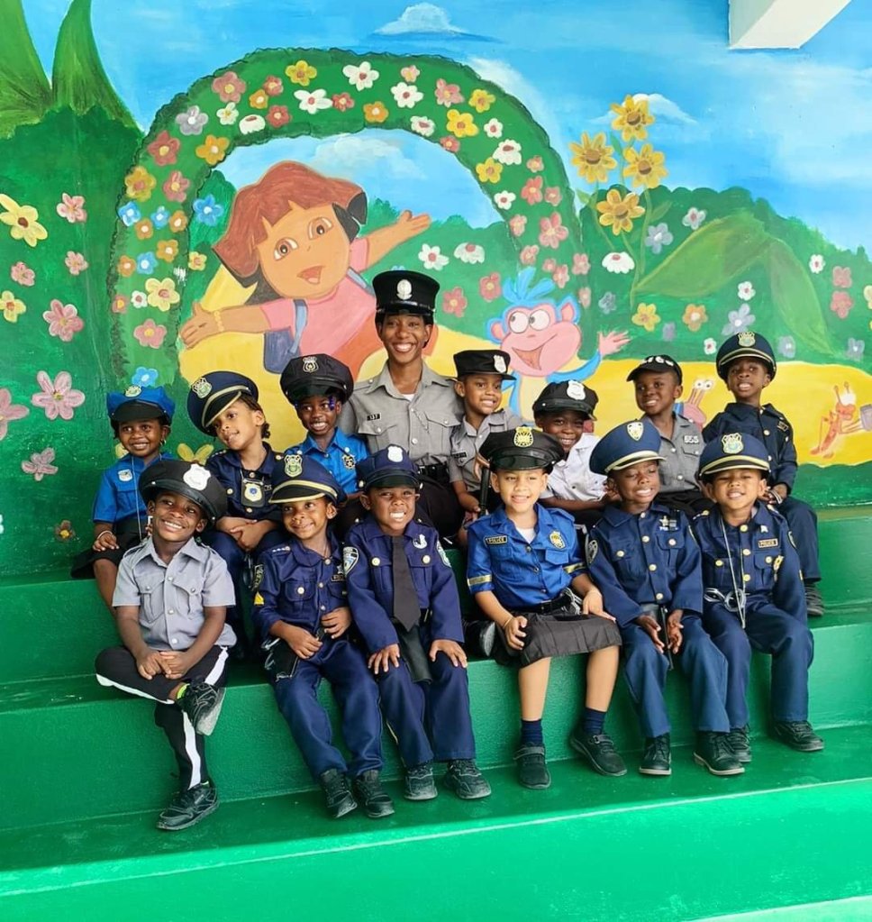 Constable Keriann Thomas, Miss Reigning Police, and OECS Queen, along with Constable De-onte Francis of All Saints Police Station are seen with future law enforcement officers and firefighters at Heritage House Preschool for Career Day 2023.
