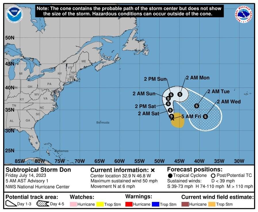 National Hurricane Center (NHC) – At 500 AM AST (0900 UTC), the center of Subtropical Storm Don was about 1165 miles (1875 km) west southwest of the Azores (latitude 32.9 North, longitude 46.8 West).