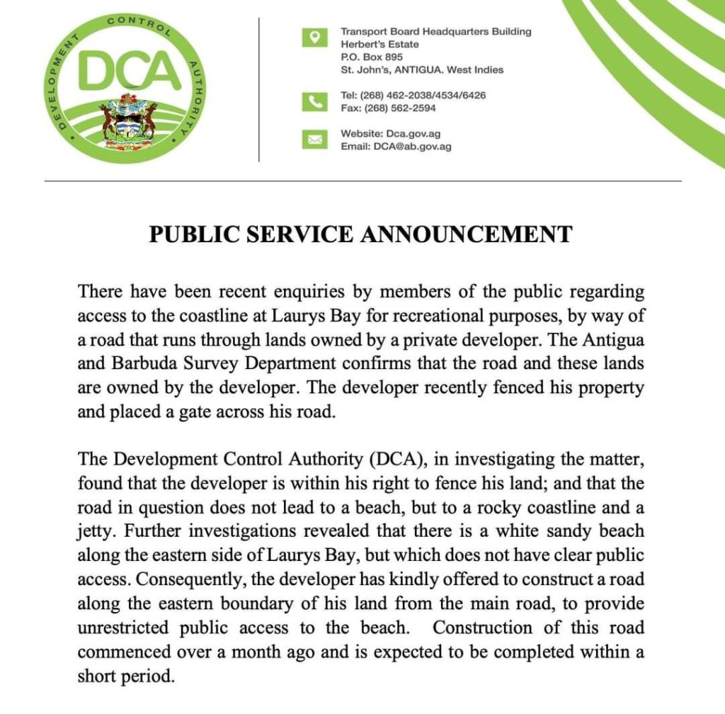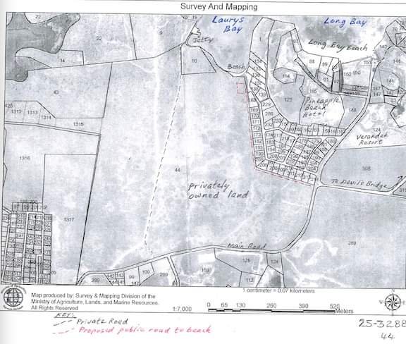 The Antigua and Barbuda Survey Department confirms that the road and these lands are owned by the developer. The developer recently fenced his property and placed a gate across his road.