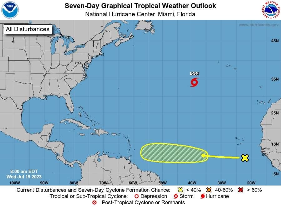 National Hurricane Centre (NHC) – In the eastern Tropical Atlantic, cloudiness and showers over the eastern tropical Atlantic centered a few hundred miles south of the Cabo Verde Islands are associated with a tropical wave.