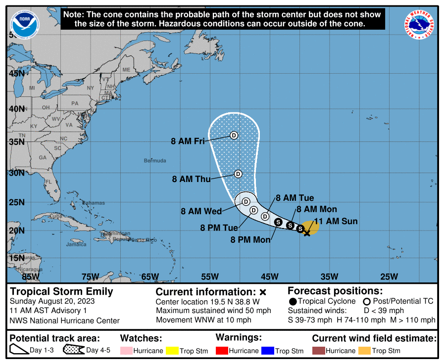 At 1100 AM AST (1500 UTC), the center of Tropical Storm Emily was located near latitude 19.5 North, longitude 38.8 West. Emily is moving toward the west-northwest near 10 mph (17 km/h) and this motion is expected to continue for the next several days.
