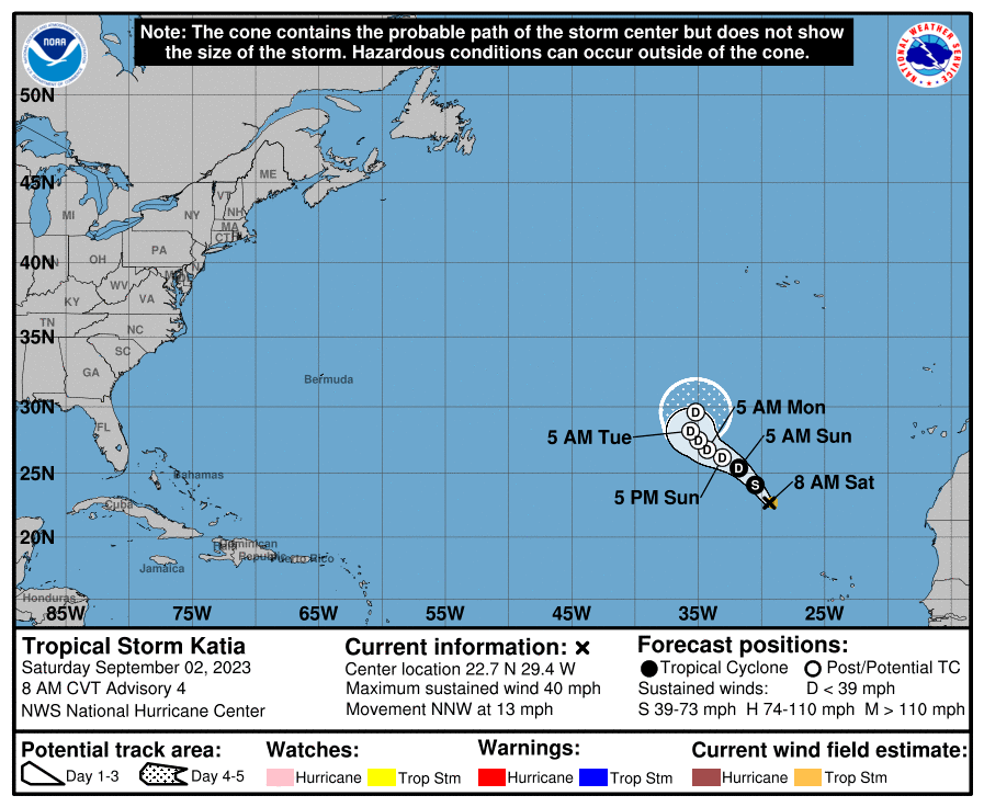 National Hurricane Center (NHC) – At 800 AM CVT (0900 UTC), the center of Tropical Storm Katia was located near latitude 22.7 North, longitude 29.4 West. Katia is moving toward the north-northwest near 13 mph (20 km/h).