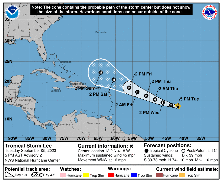 National Hurricane Center (NHC) – Interests in the Leeward Islands should monitor the progress of this system. At 500 PM AST (2100 UTC), the center of Tropical Storm Lee was located near latitude 13.2 North, longitude 41.8 West.
