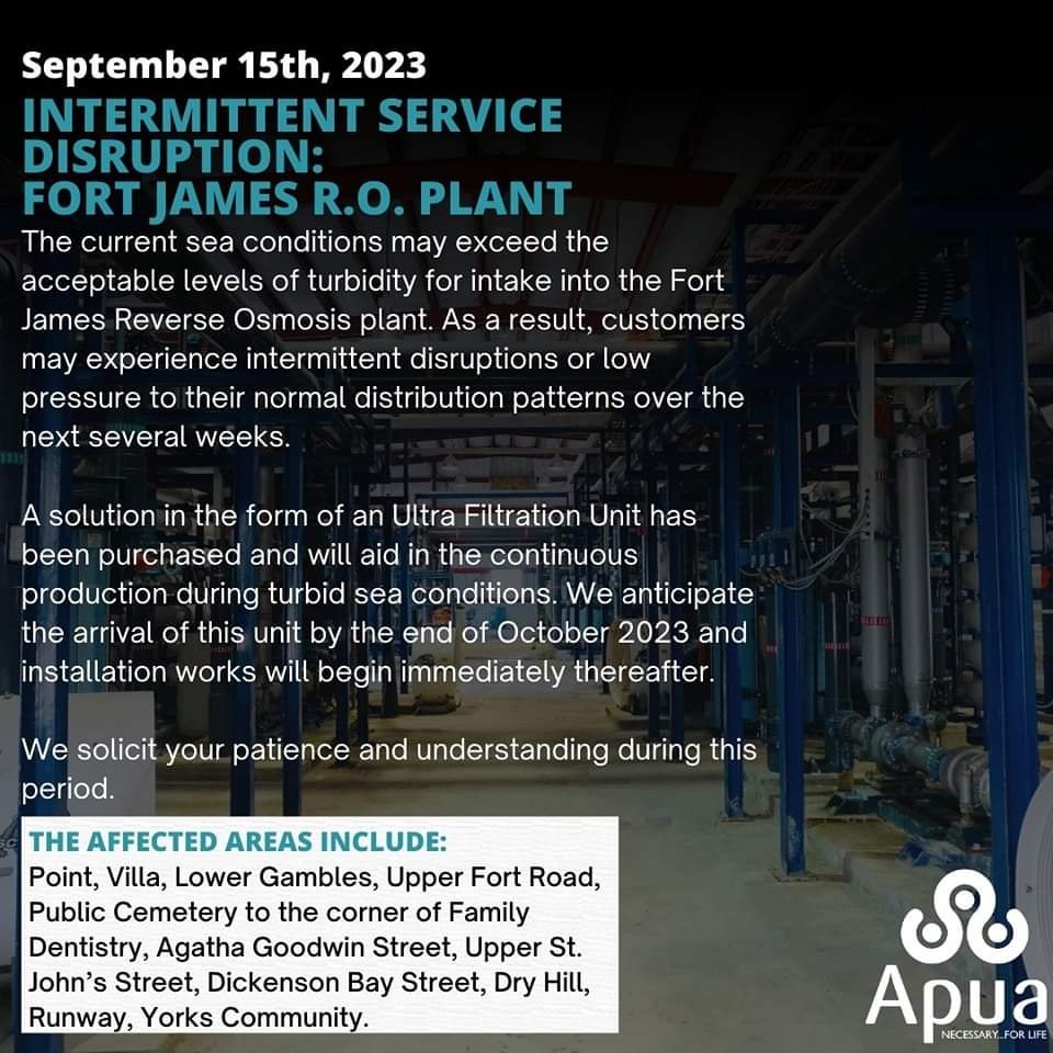 September 15th, 2023 – The current sea conditions may exceed the acceptable levels of turbidity for intake into the Fort James Reverse Osmosis plant.