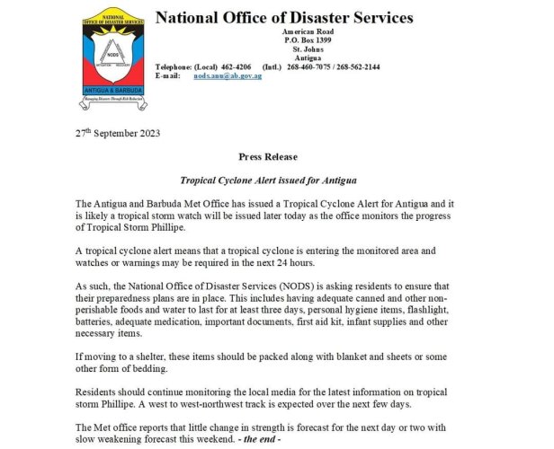 National Office of Disaster Services (NODS) – The Antigua and Barbuda Met Office has issued a Tropical Cyclone Alert for Antigua. This means that a tropical cyclone is entering the monitored area and watches or warnings may be required in the next 24 hours.