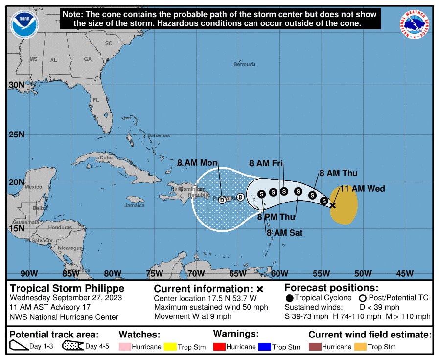 At 11 am ECT or 1500 UTC, the centre of Tropical storm Philippe was located near latitude 17.5 north, longitude 53.7 west or about 528 miles east of the Leeward Islands and 628 miles east-southeast of the British Virgin islands moving west at 9 mph. A west to west-northwest track is expected over the next few days.