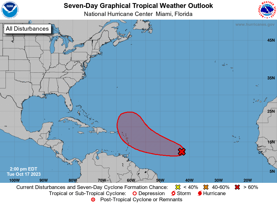 AL94 continues to move closer to the eastern Caribbean. Although there is uncertainty concerning its eventual path and strength, AL94 has the potential to impact the Leeward Islands and the British Virgin Islands bringing cloudiness, showers, thunderstorms and gusty winds as early as Friday.