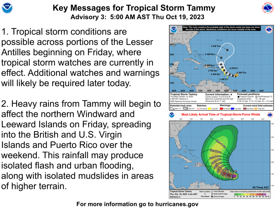 A turn toward the west-northwest is forecast by tonight, followed by a turn toward the northwest Friday night or Saturday. On the forecast track, the center of Tammy will move near or over the Leeward Islands Friday and Saturday.