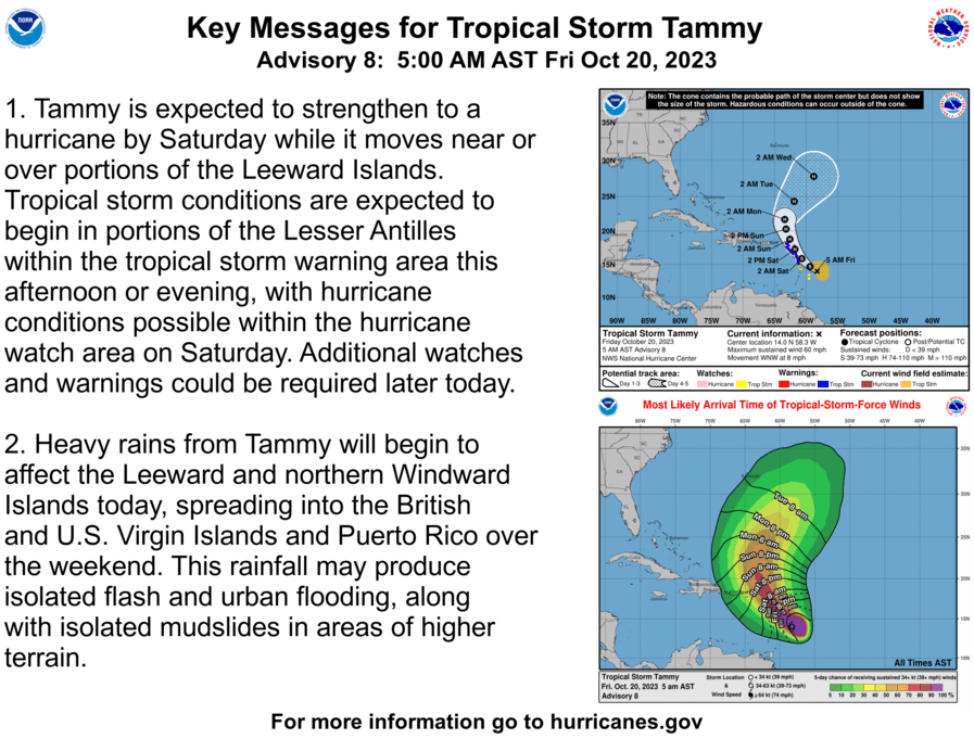 A turn toward the northwest is anticipated by this evening, followed by a north-northwestward and northward turn Saturday night through Sunday night. On the forecast track, the center of Tammy will move near or over portions of the Leeward Islands tonight and on Saturday, and then move north of the northern Leeward Islands on Sunday.