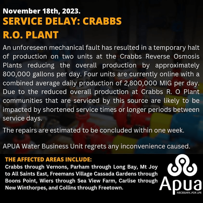 The Antigua Public Utilities Authority (APUA) wishes to inform the general public of its delayed distribution of water.