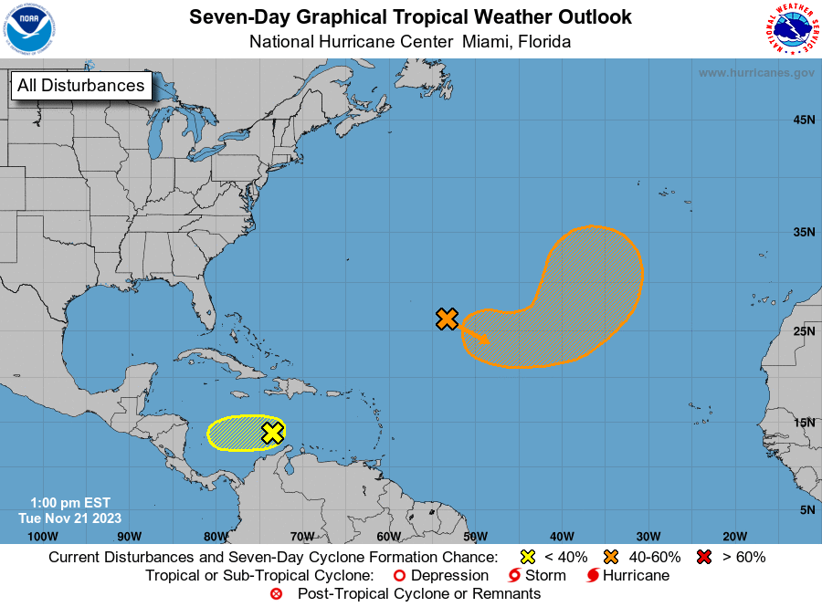 1. Central Caribbean Sea (AL99): Showers and thunderstorms associated with a small area of low pressure over the central Caribbean have not become any better organized today.