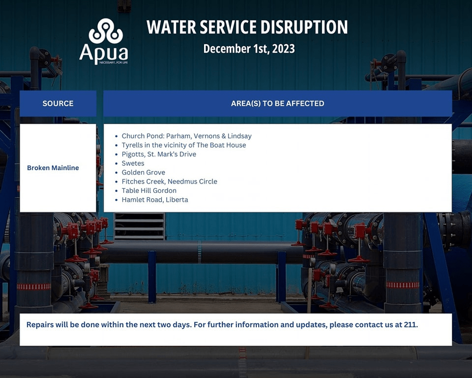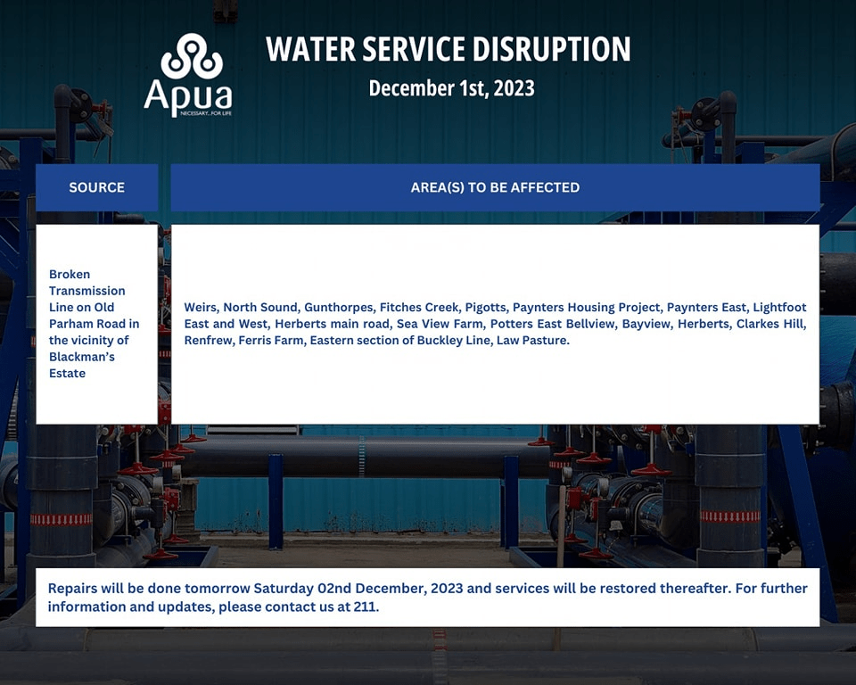The Antigua Public Utilities Authority (APUA) wishes to inform the public of disruption to its water service in the following areas: