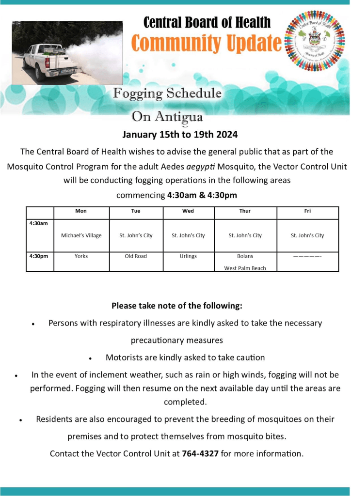 The Central Board of Health has released its fogging schedule for Antigua from 15th to 19th January 2024.