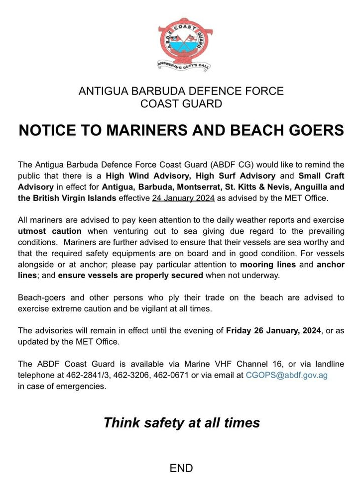 The following notice has been issued by the Antigua and Barbuda Defence Force Coast Guard (ABDF-CG). The general public is asked to take heed of this notice and to follow all safety protocols.