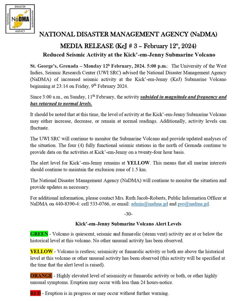 NATIONAL DISASTER MANAGEMENT AGENCY (NaDMA) MEDIA RELEASE (Kick em Jenny # 3 – February 12th, 2024)