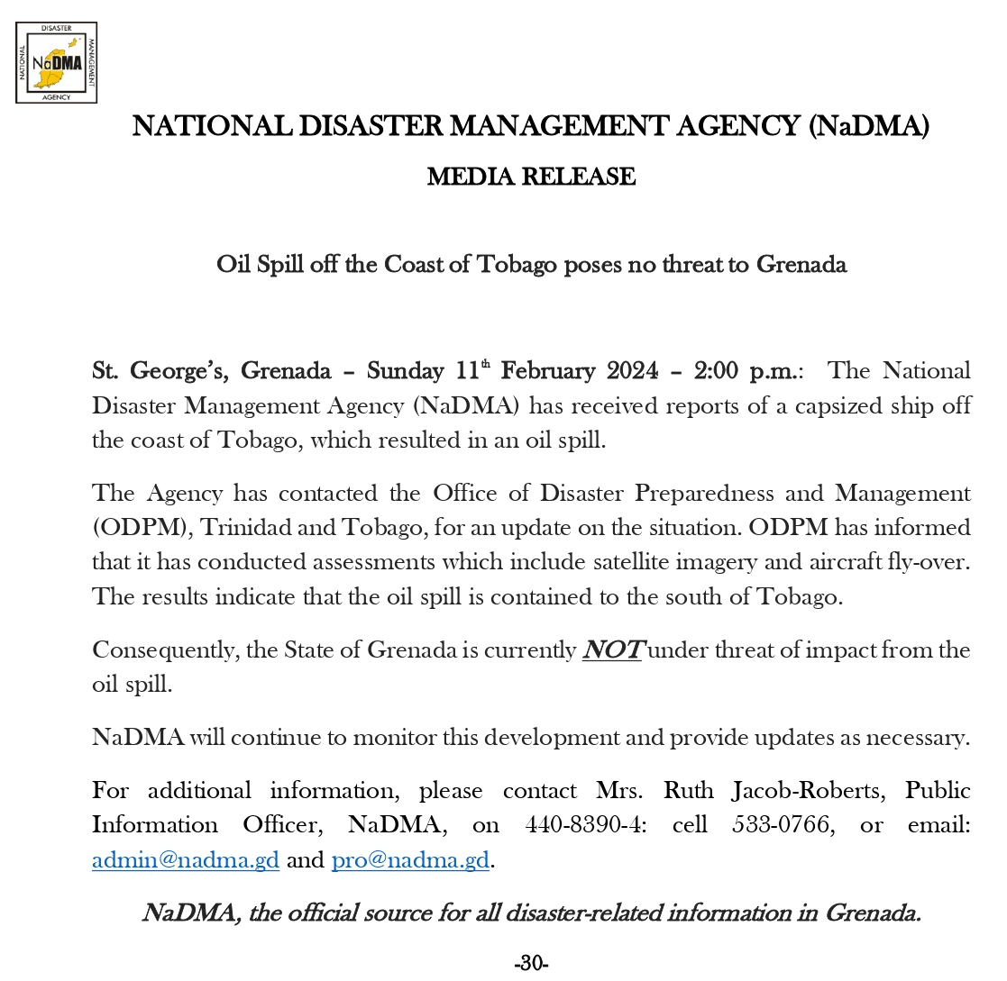 St. George’s Grenada – Sunday 11th February 2024 – 2:00 p.m.: The National Disaster Management Agency (NaDMA) has received reports of a capsized ship off the coast of Tobago, which resulted in an oil spill.