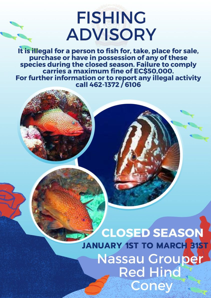 Antigua and Barbuda Defence Force (ABDF) – Please be advised that the closed season for the Nassau Grouper Red Hind and Coney begins January 1st to March 31st 2024.