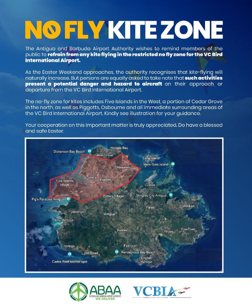 The Antigua and Barbuda Airport Authority (ABAA) wishes to remind members of the public to refrain from any kite flying in the restricted no fly zone for the VC Bird International Airport.