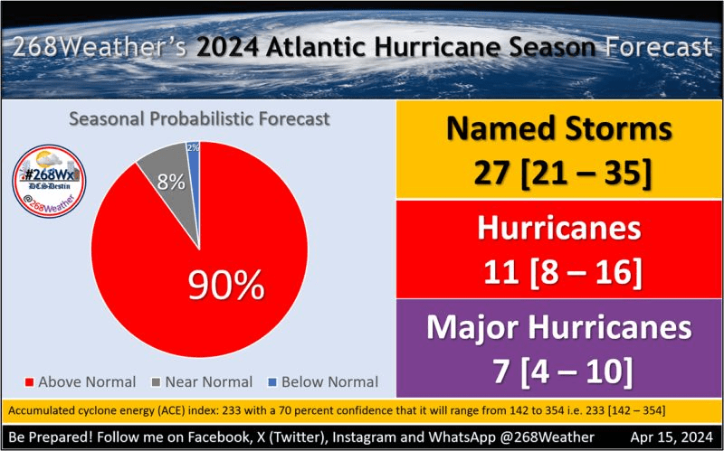 The prediction is for a near record-breaking 27 named storms, 11 hurricanes, 7 major hurricanes and an accumulated cyclone energy index (ACE) of 233.