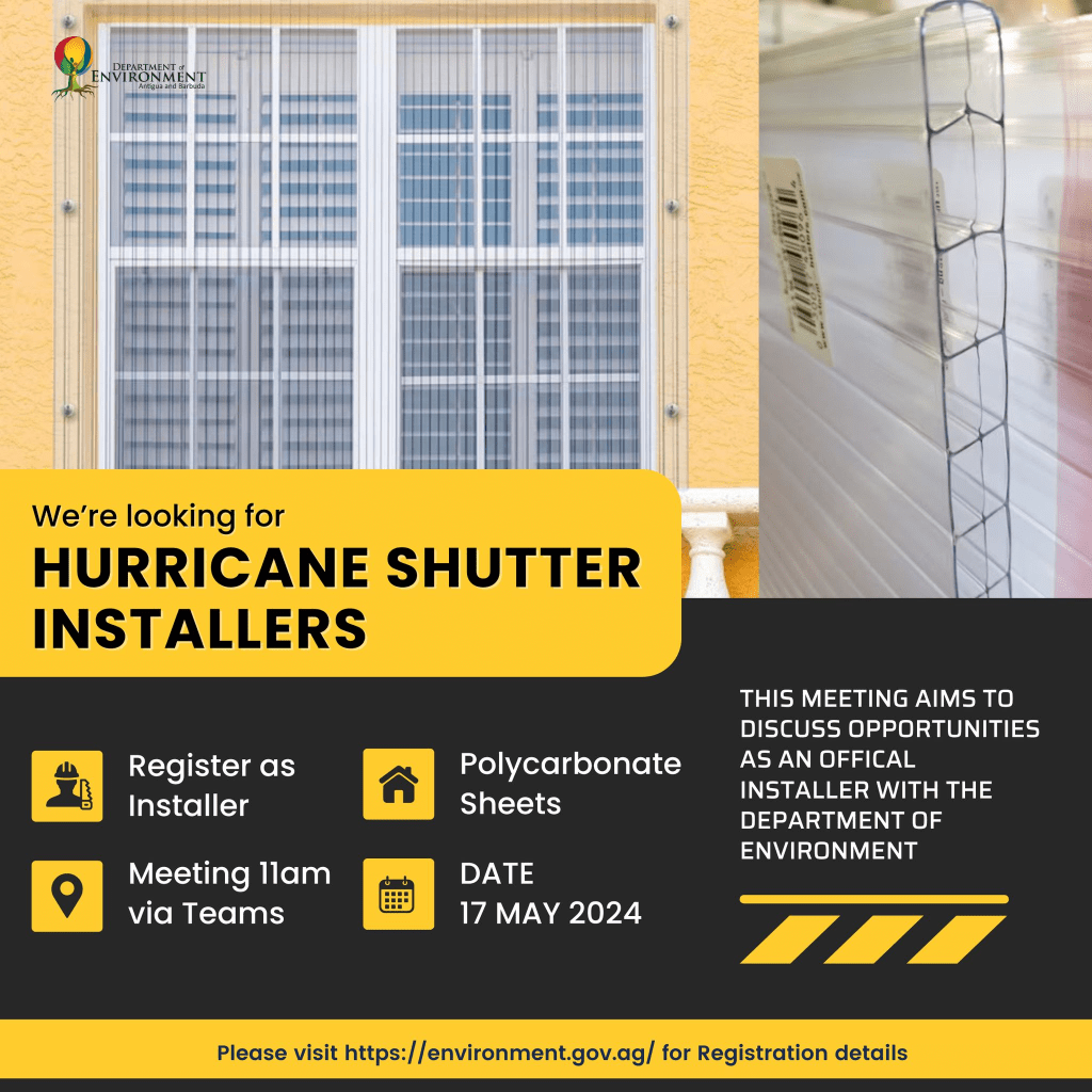 This meeting aims to discuss opportunities, for you to become registered as an official installer of polycarbonate sheets to be used as hurricane shutters, for projects and programs at the Department of Environment.