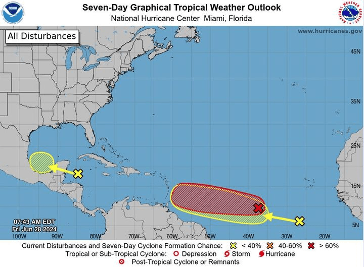 For the Caribbean Sea, the National Hurricane Center continues to monitor two areas of interest in the Atlantic;