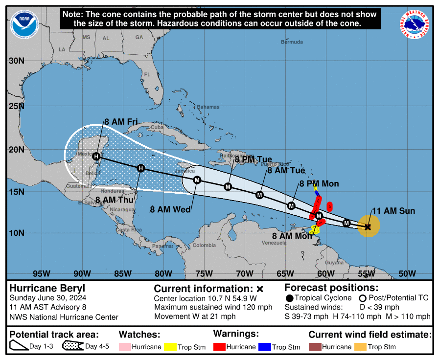 A continued quick westward to west-northwestward motion is expected during the next few days. On the forecast track, the center of Beryl is expected to move across the Windward Islands Monday morning and across the southeastern and central Caribbean Sea late Monday through Wednesday.