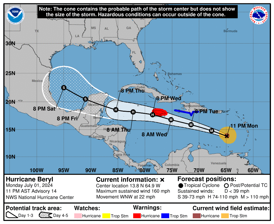 At 1100 PM AST (0300 UTC), the center of Hurricane Beryl was located near latitude 13.8 North, longitude 64.9 West. Beryl is moving toward the west-northwest near 22 mph (35 km/h). Beryl is forecast to continue moving rapidly west-northwestward during the next couple of days.