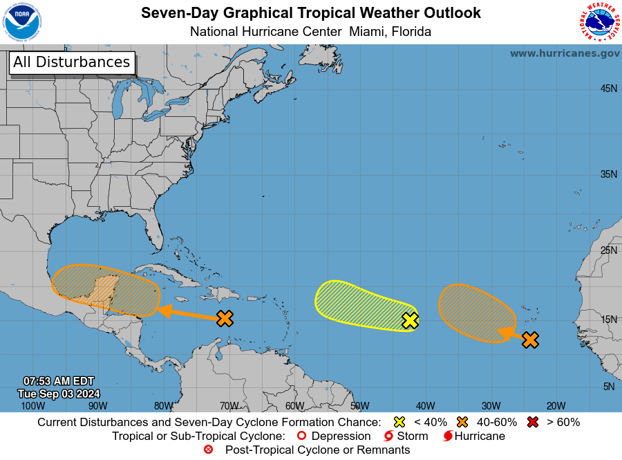 National Hurricane Center (NHC): This Tuesday, a tropical wave is producing disorganized showers and thunderstorms over Hispaniola and portions of the central Caribbean Sea.