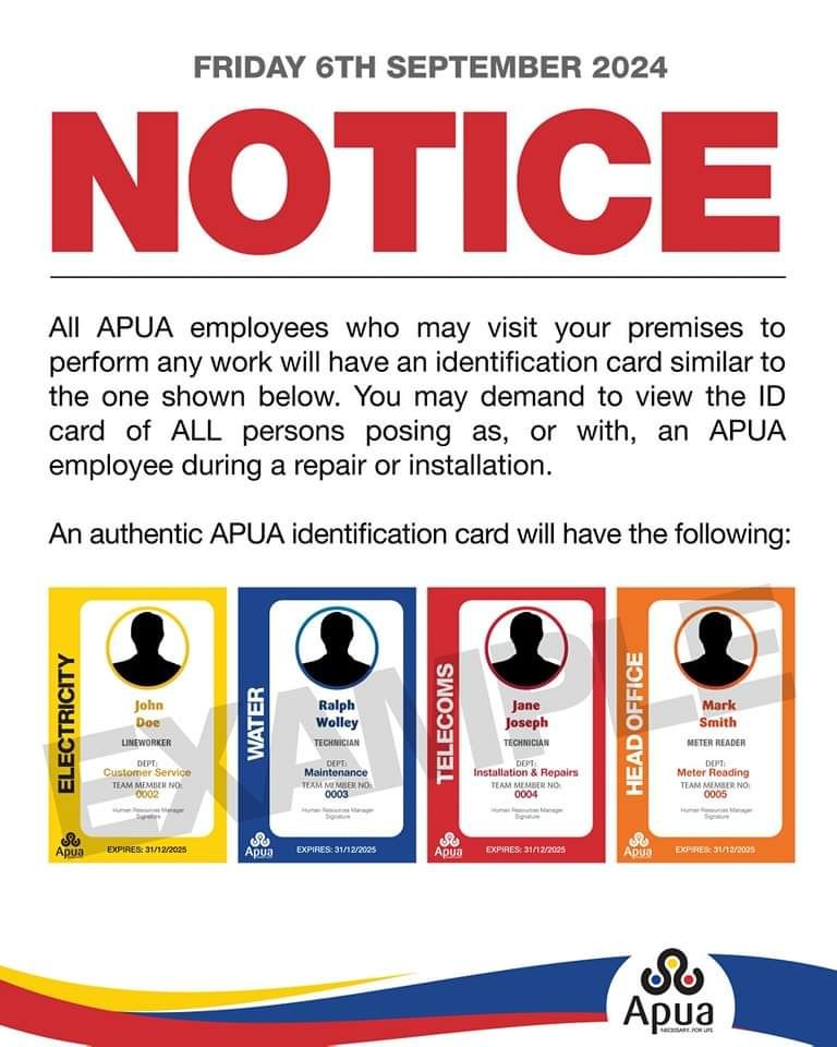 The general public is reminded that all APUA employees, in addition to wearing branded uniforms, are equipped with company-issued identification cards.