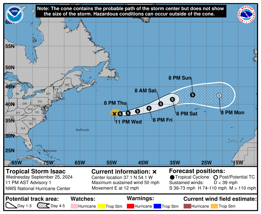 At 1100 PM AST (0300 UTC), the center of Tropical Storm Isaac was located near latitude 37.1 North, longitude 54.1 West.