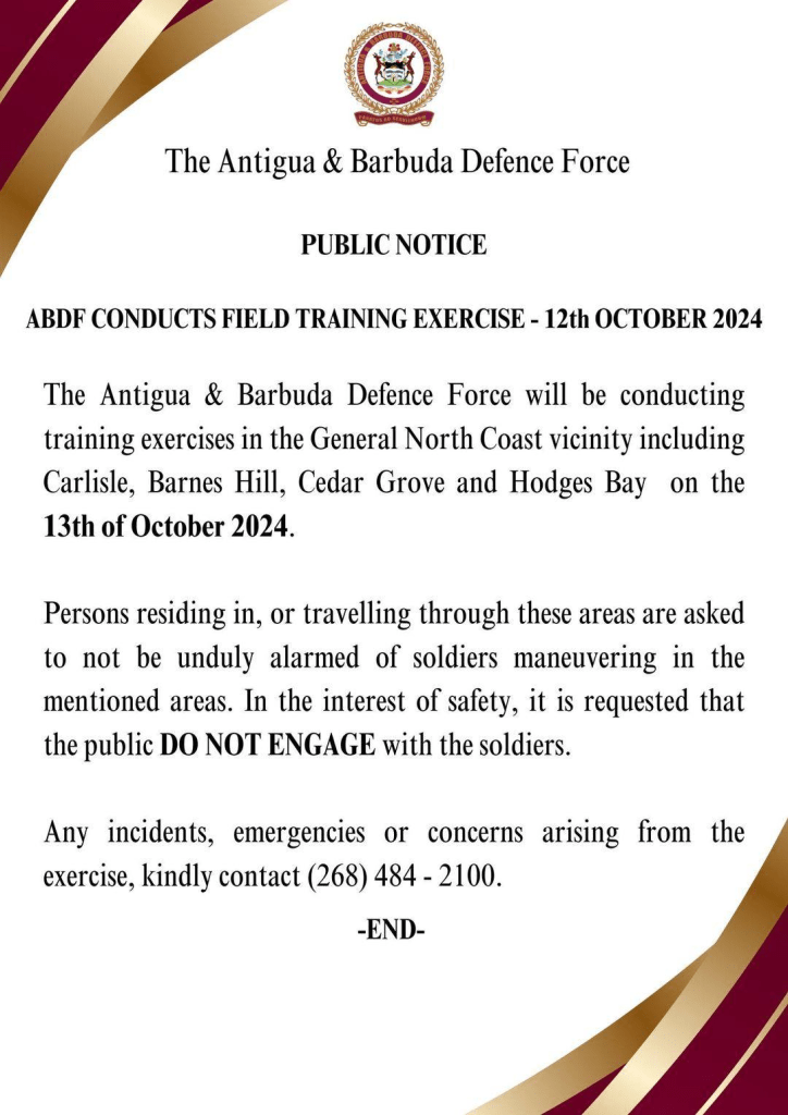 The general public is asked to take note of the following public notice from the Antigua and Barbuda Defence Force (ABDF).