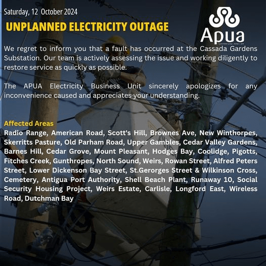 Antigua Public Utilities Authority (APUA): The power outage today (12th October 2024 ), was caused by an iguana coming into contact with the top of a breaker at the Cassada Gardens substation, resulting in a short circuit.