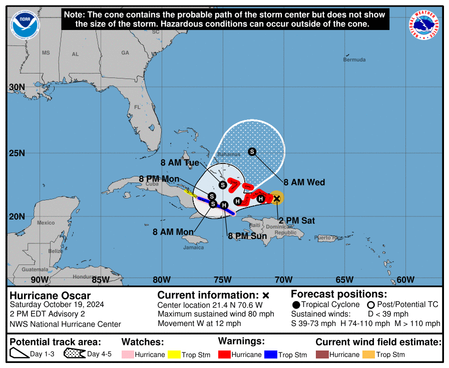 At 200 PM EDT (1800 UTC), the center of Hurricane Oscar was located near latitude 21.4 North, longitude 70.6 West.