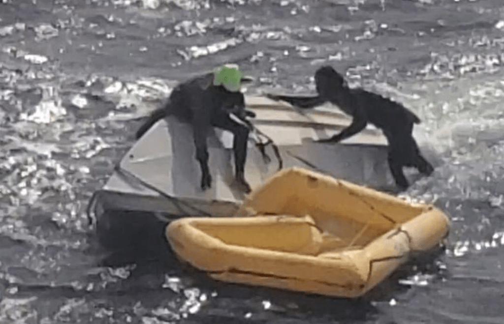When the helicopter arrived, the men waved and embraced, clearly relieved after a night adrift.